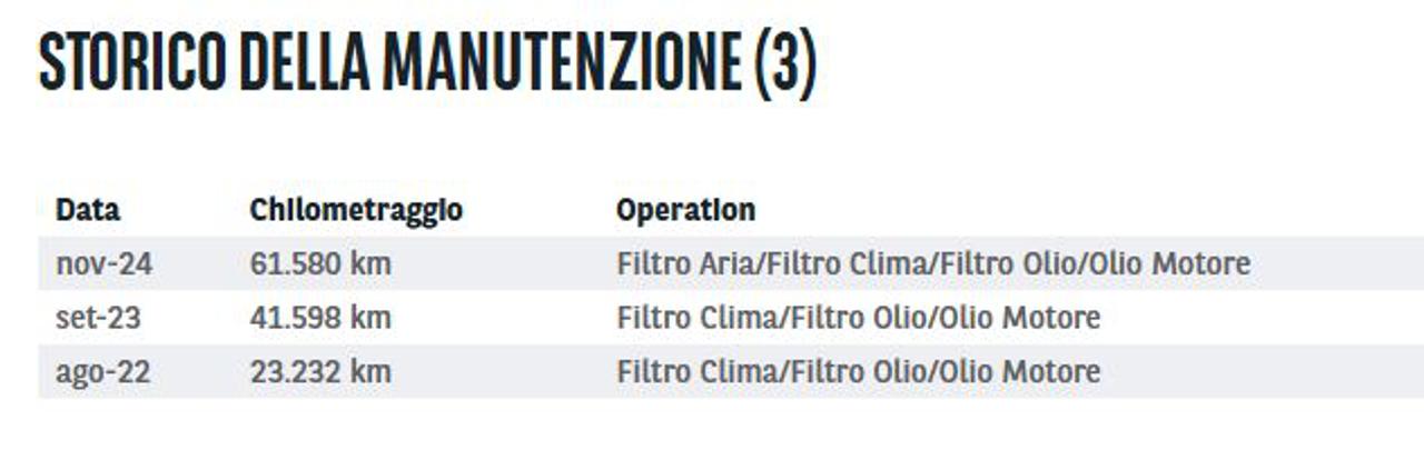 • Tagliandi fatti a: 63.909 km il 28/11/2024; 41.598 km il 09/2023; 23.232 km il 04/08/2022; prossimo tagliando gratuito prima della consegna.